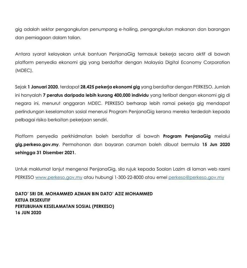 Mengikut ruu yang dibentangkan menteri sumber manusia datuk seri richard riot jaem itu, setiap orang yang bekerja sendiri perlu berdaftar dan membayar caruman kepada pertubuhan keselamatan sosial (perkeso) mengikut cara ditetapkan bagi setiap aktiviti pekerjaan sendiri yang dijalankan. Menara perkeso, 281 jalan ampang, 50538. Untuk makluman, terdapat beberapa kekosongan jawatan yang dibuka untuk permohonan oleh pihak pertubuhan keselamatan sosial (perkeso). Kumpulan wang keselamatan sosial b. Beliau juga menerima nasib sama dengan pekerja lain yang menerima gaji rm400 sejak mac.