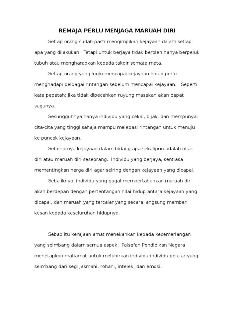 Kepentingan menjaga maruah diri pendidikan moral. Selain itu, masyarakat yang sejahtera dan bersatu padu dapat dilahirkan. Anda di halaman 1 dari 6. The copyright of the image is owned by the owner, this website only displays a few snippets of several keywords that are put together in a post summary. Orang yang menjaga maruahnya adalah orang yang berada di landasan yang betul dan sering melakukan perkara yang betul dan baik.