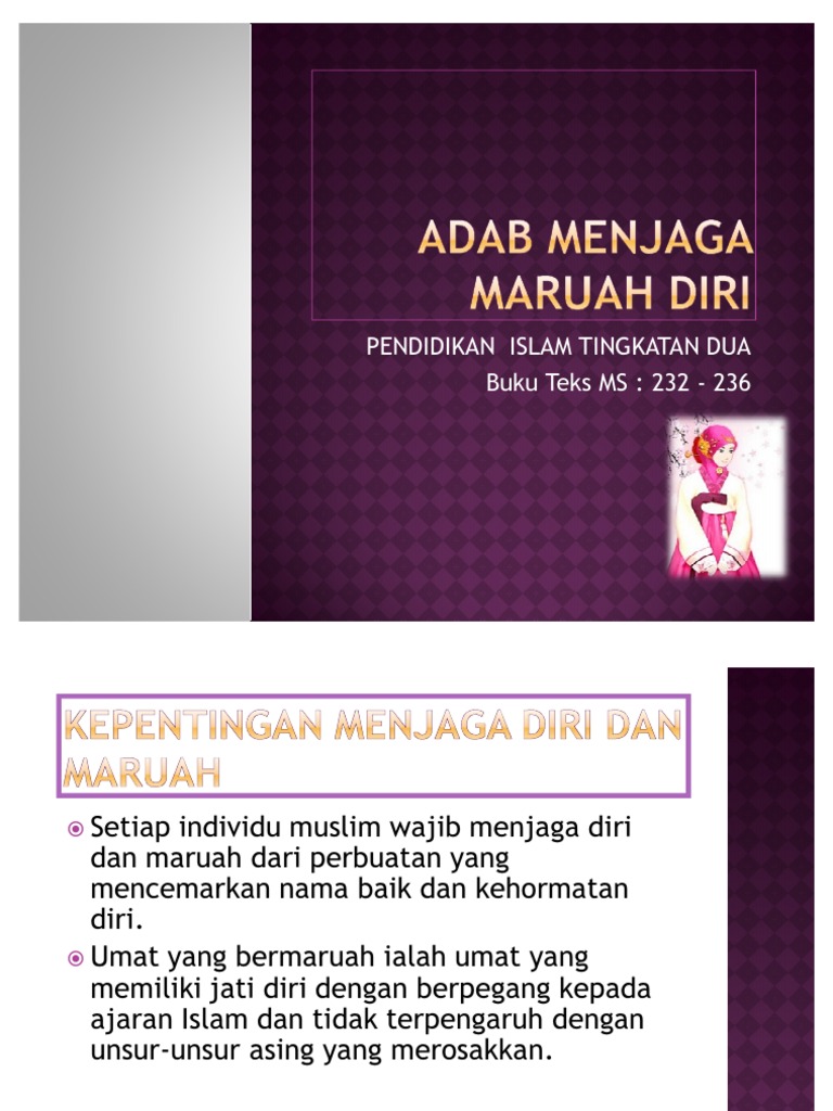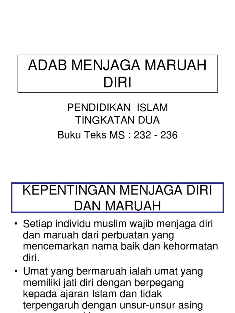 Orang yang menjaga maruahnya adalah orang yang berada di landasan yang betul dan sering melakukan perkara yang betul dan baik. Ppt adab menjaga maruah diri powerpoint presentation free download id 489422. Keistimewaan sektor pelancongan di malaysia. Kepentingan menjaga maruah diri pendidikan moral. Dua2052 kepentingan menjaga maruah diri youtube. Pendidikan islam tingkatan 1 smk jabi pelajaran 30 maruah diri cermin peribadi. Ppt adab menjaga maruah diri powerpoint presentation free download id 489422. 2 apakah cara menjaga maruah diri??? Keburukan buah tunjuk langit keburukan sains dan teknologi kebaikan kepelbagaian kaum di malaysia kebaikan sistem demokrasi berparlimen di malaysia kedudukan istimewa orang melayu dan bumiputera sabah dan sarawak dalam perlembagaan malaysia keceriaan pusat sumber sekolah rendah kedudukan islam dalam perlembagaan malaysia kedudukan agama islam dalam. Adab menjaga maruah diri ppt download. Ppt adab menjaga maruah diri powerpoint presentation free download id 489422. To find out more complete and clear information or images, you can. Selain itu, masyarakat yang sejahtera dan bersatu padu dapat dilahirkan.