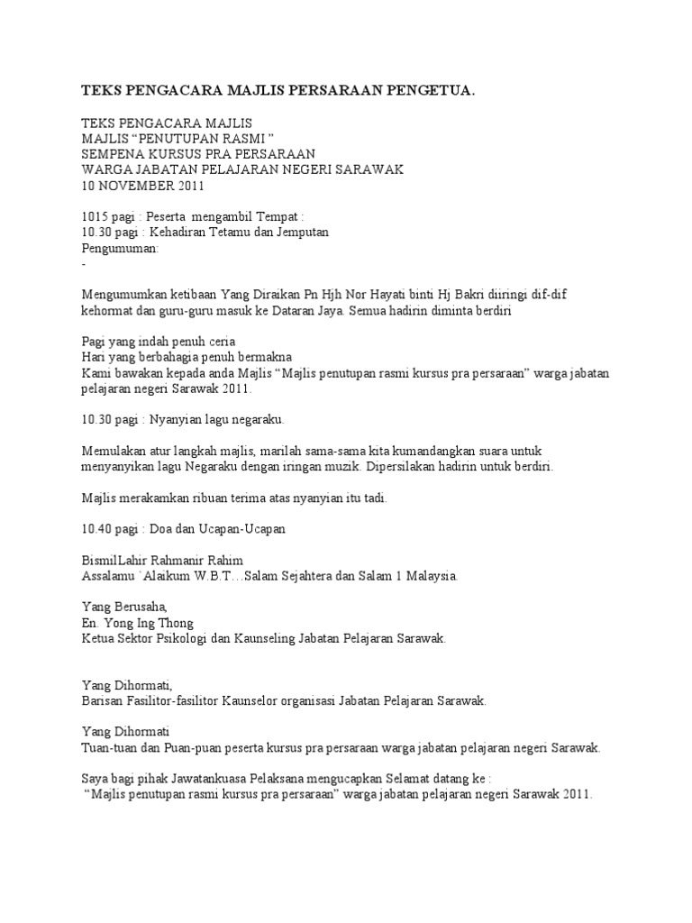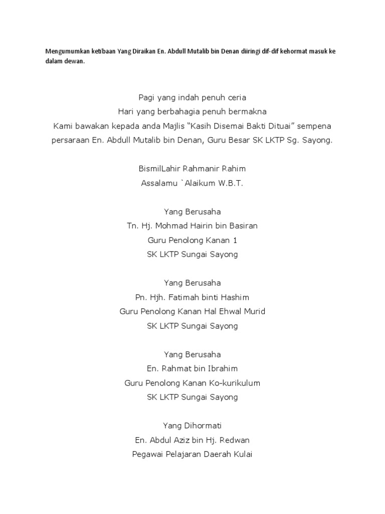 Teks ucapan ucapan majlis perpisahan persaraan yang yang berusaha dan dihormati 1. Yang saya hormati tuan pengerusi majlis, yang diraikan encik adnan bin abdul rahman,yang berusaha puan alifah binti ali oleh itu, persaraan beliau akan meninggalkan kesan yang mendalam dalam kalangan pelajar semua. Perpisahan boleh menjadi sedih, tapi jika anda perlu merancang majlis persaraan untuk rakan sekerja yang dikasihi, biar canva membantu anda membuat kad jemputan. Jika anda wakil pekerja nak buat ucapan. Jasamu dikenang pantun perpisahan rakan sekerja.
